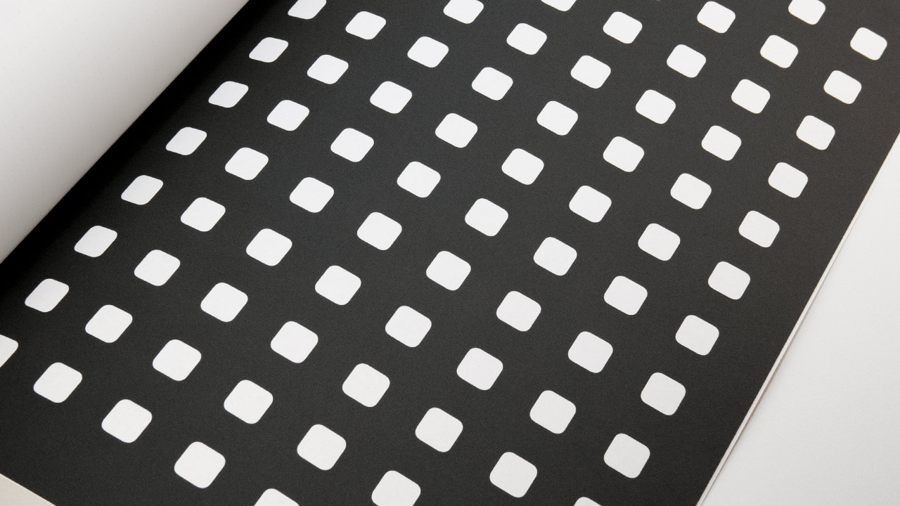 To facilitate spacing and alignment, a subtle dot grid is applied to the screen area. Carefully designed just for this sketchbook, the grid's primary pattern is bisected by a lighter, more dense secondary pattern for more detailed work. The grid system splits the screen area evenly into rows (50 primary, 100 secondary) and columns (38, 76). Center marks are provided along the screen borders and at dead center.